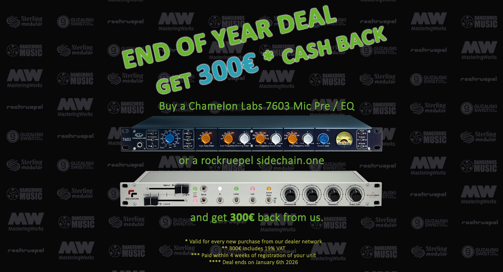 Purchase a Chameleon Labs 7603 Mic Pre or rockruepel sidechain.one and we give you 300€ back. Purchases must be made with our dealer network. Only new units.